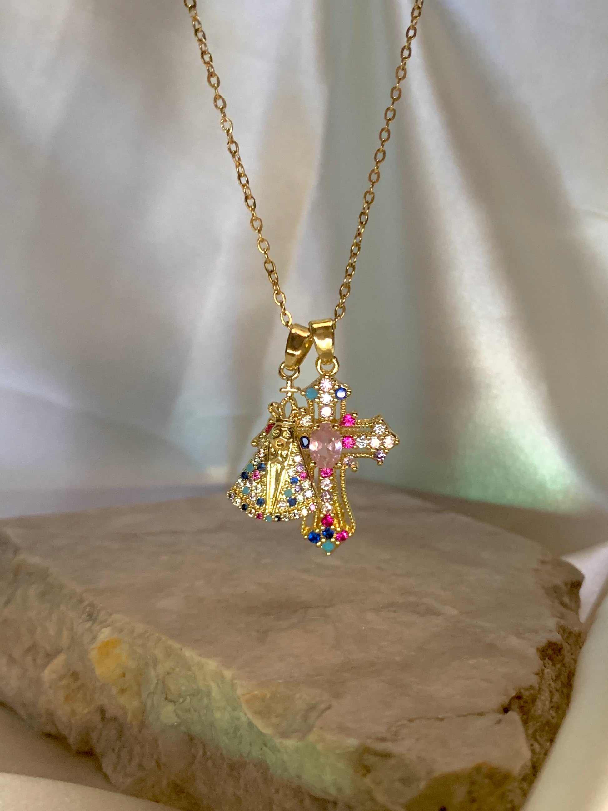 Our Multicolored Crystal Cross and Our Lady of Guadalupe pendant showcases a vibrant, elegant match. Expressing hope and faith to the divine, offering comfort and strength to believers, especially in times of adversity.
