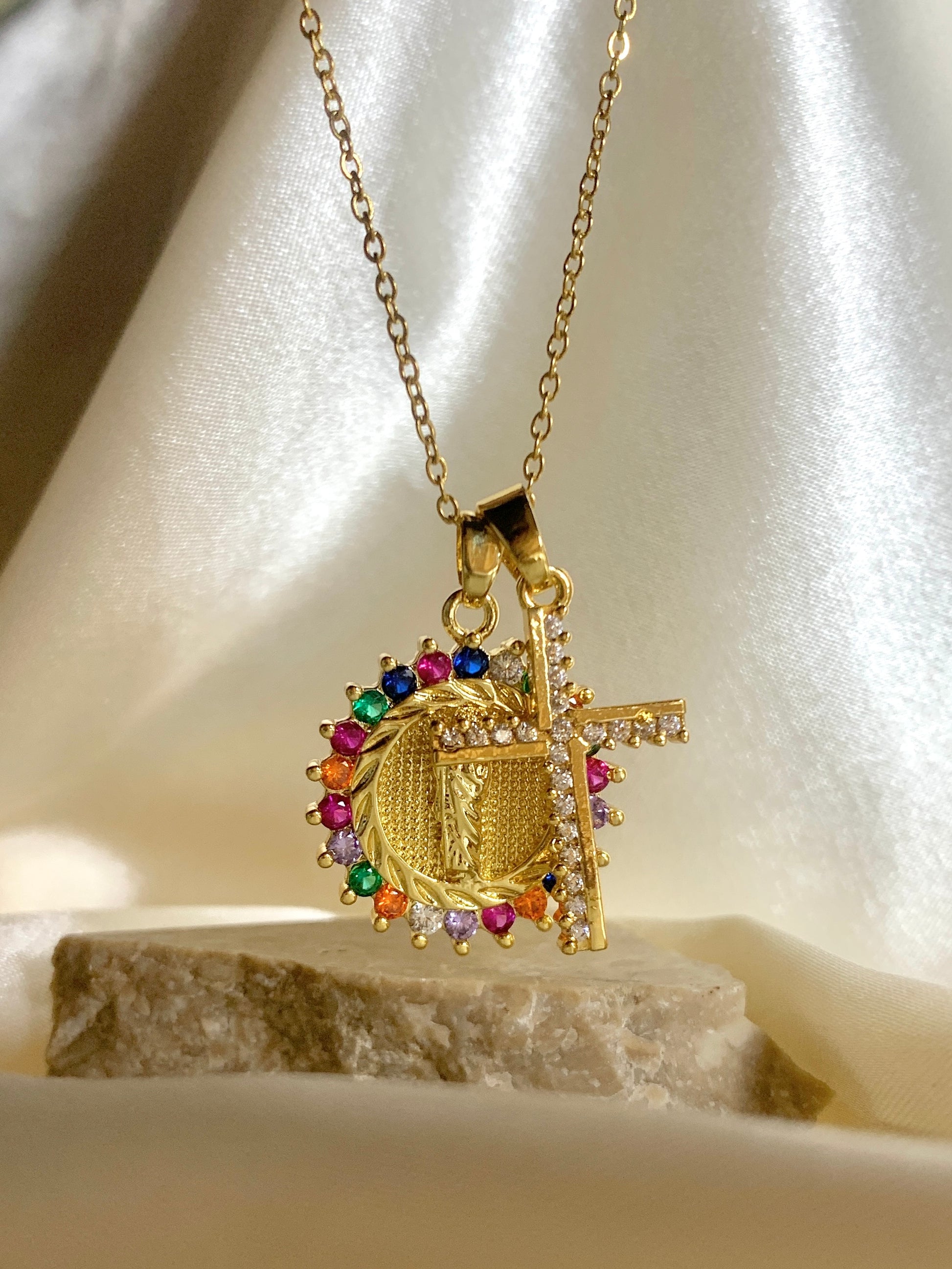 Our Crystal Cross and Our St. Jude Thaddeus pendant showcases a vibrant yet elegant match. Representing hope in times of great need. It offers comfort and strength to believers, especially in times of adversity.